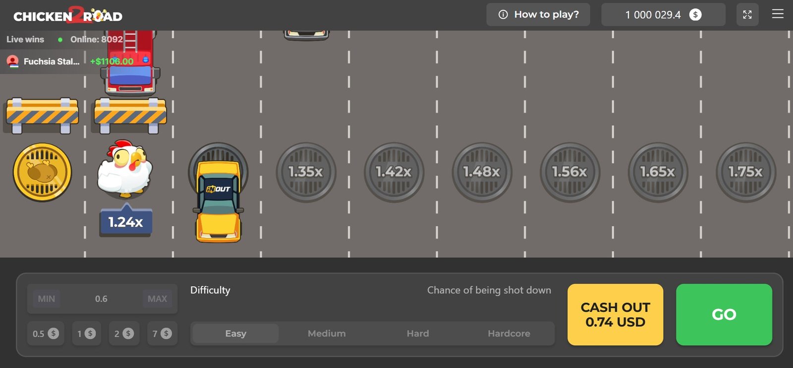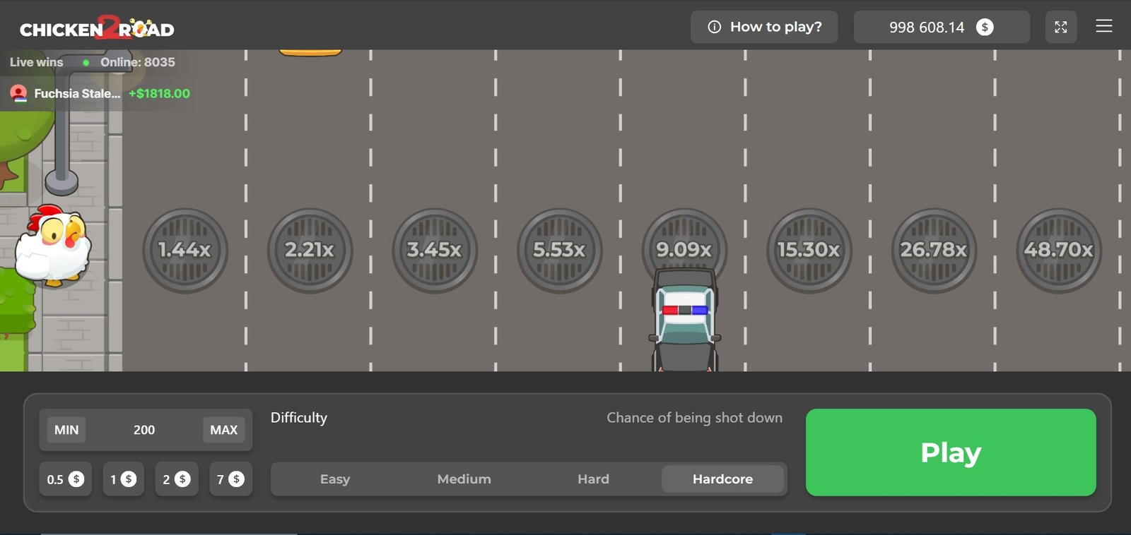 Más allá de la dificultad, en Chicken Road 2 puedes configurar tu partida de diferentes maneras. En primer lugar, tienes un rango de entre 0,10€ y 200€ para apostar (clica en “MIN” o “MAX” para hacer la apuesta mínima o máxima).